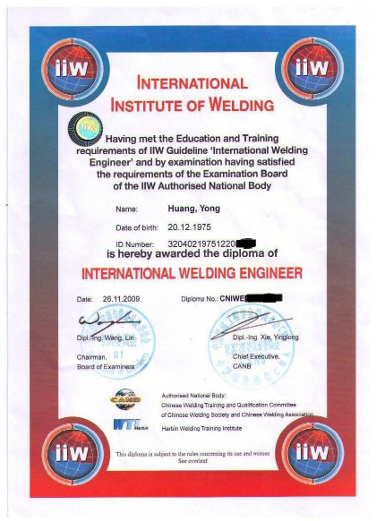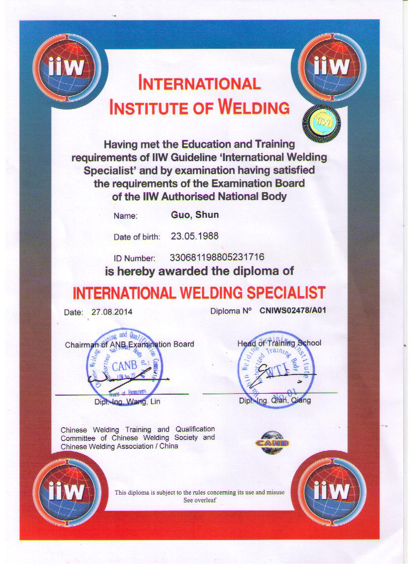 - 1名 ASNT 3級探傷人員,2名國際焊接工程師,2名國際焊接技師