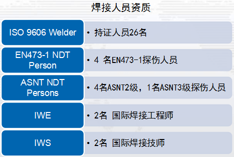 - 公司現有焊接持證人員40余名,其中4名EN473-1探傷人員,4名 ASNT 2級人員